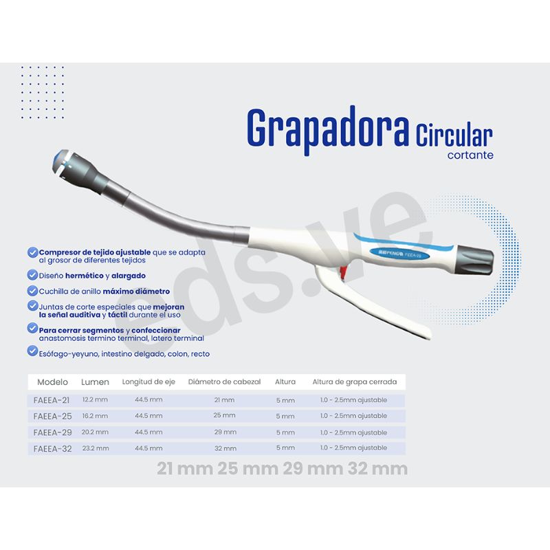 Según el diámetro exterior del yunque de la grapadora (unidad: mm), Feng ofrece cinco especificaciones: 21, 25, 29 y 32. En comparación con especificaciones similares de marcas internacionales, Feng añade, entre 25 y 29, lo que crea un diámetro interno óptimo de la anastomosis y ofrece más opciones de diámetro para los cirujanos en cirugía esofágica torácica.
