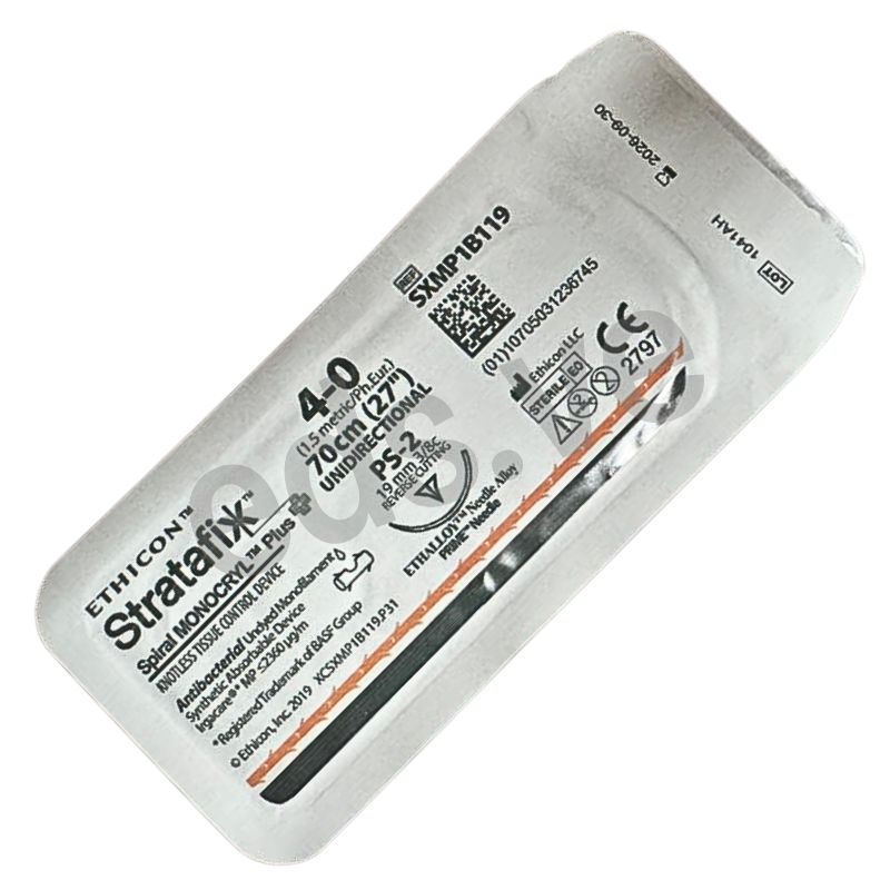 La sutura STRATAFIX™ Spiral MONOCRYL™ Plus (SXMP1B119) es un dispositivo de control de tejidos sin nudos, absorbible y antibacteriano, de calibre 4-0, 70 cm de longitud y con aguja PS-2 (19mm 3/8). Diseñada por Ethicon, ofrece una fijación consistente, segura y rápida gracias a sus púas espirales unidireccionales.