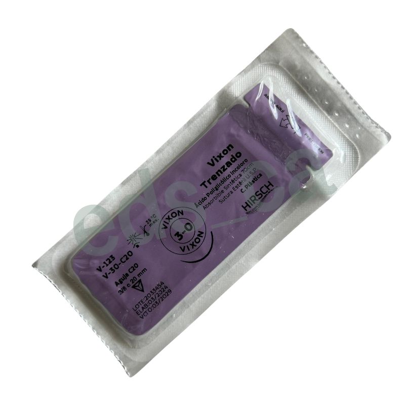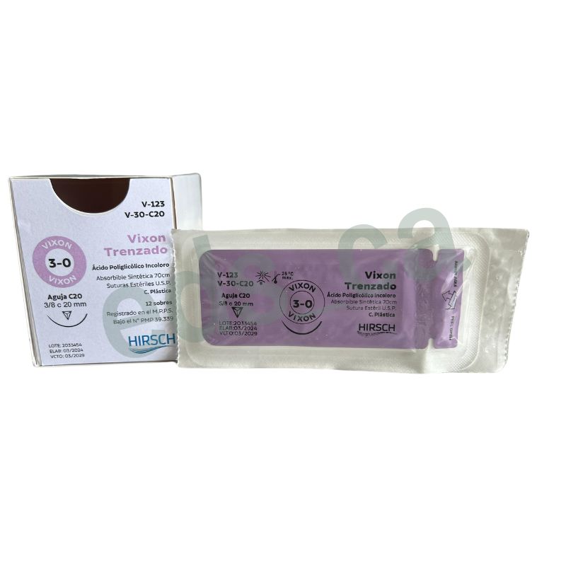 Sutura Vicryl 3/0 VIXON Aguja de 3/8 o C 20 mm Punta Cortante Absorbible Hebra Incolora de 70 cm Equivalente = J123H - HIRSCH cantidad